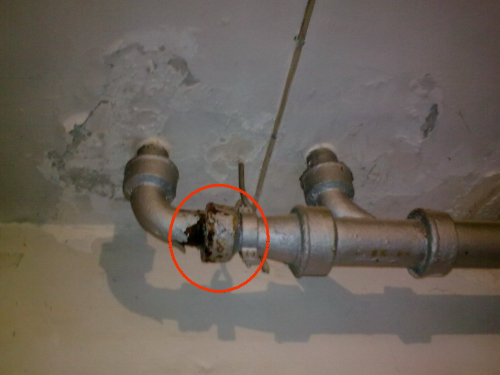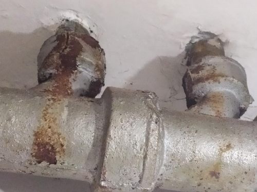 3、先把鑄鐵管拿鑄鐵焊條改成立式朝向下水,接著在后接管件頂端預置一個接頭,再把自家下水的PVC管接到接頭里面,把此接頭朝著自家下水的窟窿,之后在鑄鐵接頭內(nèi),PVC管周遭打上防水膩子,最后抹上防水膠即可。
